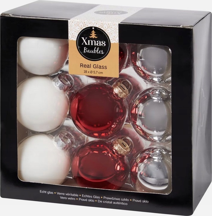 W zestawie 18 szt starannie zapakowanych bombek z błyszczącym wykończeniem.