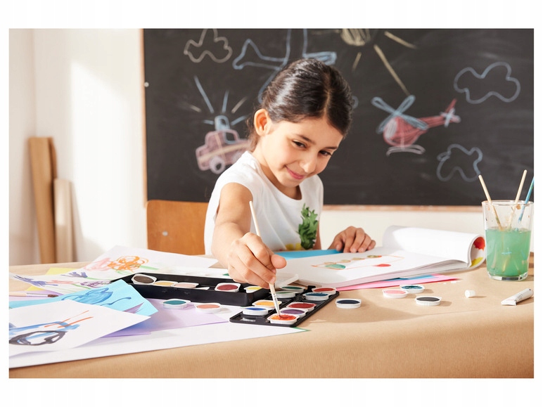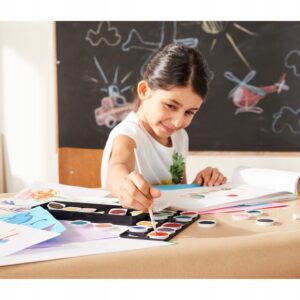 Zestaw posiada zdejmowaną pokrywę z pudełkami do mieszania kolorów, pomaga w tworzeniu własnych unikalnych odcieni. Dodatkowo, wyjmowane kubki na farbę ułatwiają organizację i czyszczenie po użyciu.