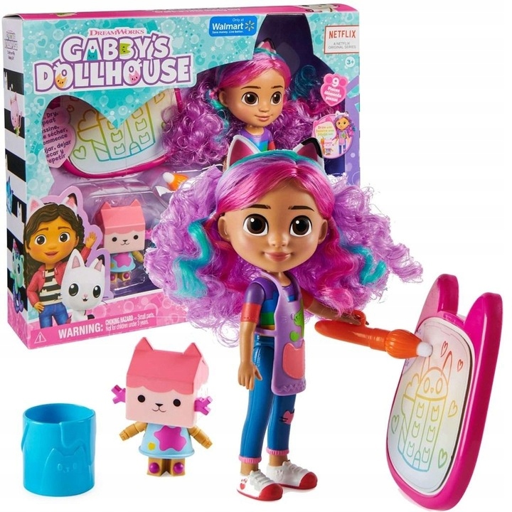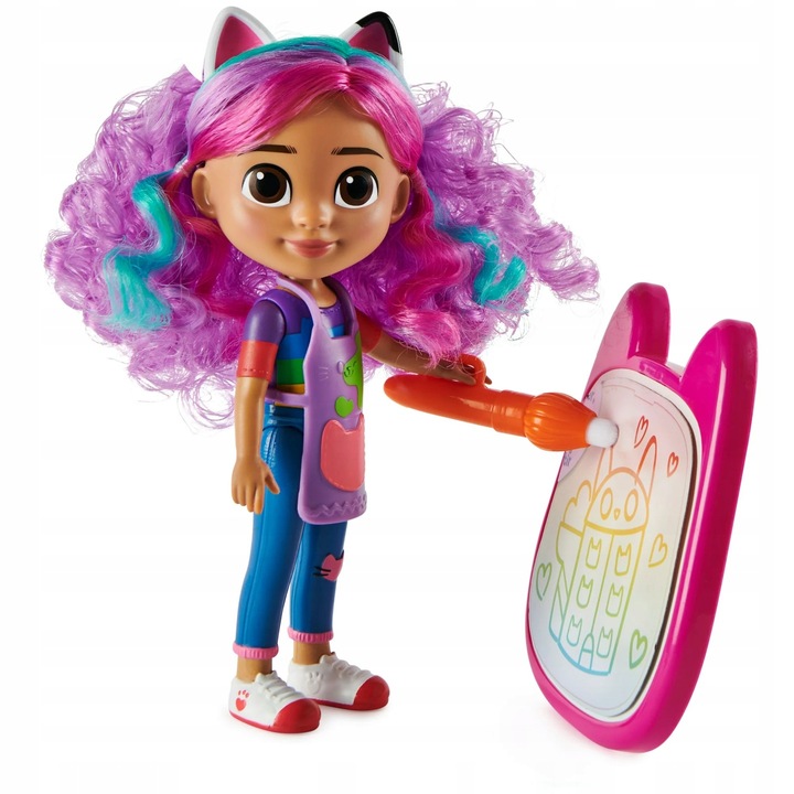 Zawartość: 1 x lalka Gabi, 1 x figurka kotka, 1 x pędzel do malowania wodą, 1 x podkładka z naklejką zmieniająca kolor pod wypływem wody, 3 x kubek, 1 x fartuch malarski, 3 x karta aktywności.