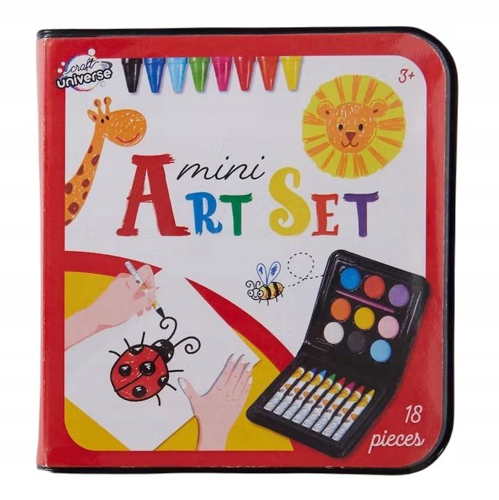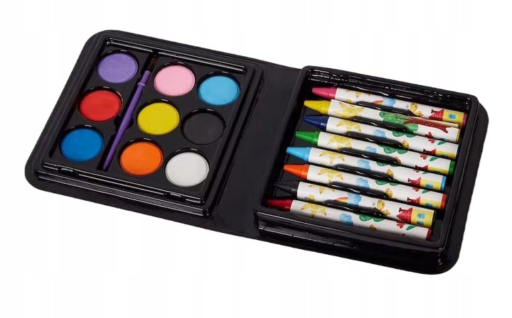 Mini zestaw artystyczny z kredkami i farbkami w środku. Idealny, aby zabrać go w podróż. W poręcznym pojemniku do przechowywania. Zawartość opakowania: