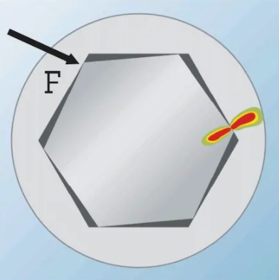 Siła jest rozkładana na profilowanych powierzchniach na wszystkich bokach sześcianu. Zmniejsza to obciążenie śruby i grotu