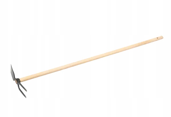 Lekka motyka ogrodowa z trzonkiem z drewna jesionowego o dług. 1350 mm, szerokim ostrzem i dwoma zębami
