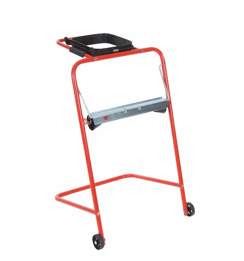 Dozownik jest wyposażony w uchwyt na worek na odpadki, a jego kółka ułatwiają transport.