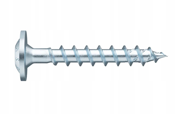 Wkręt z gwintem pełnym i dużym łbem do okuć płaskich, do mocowania części metalowych lub cienkich płyt ze sklejki do drewna w obszarze pakowania, do zastosowań w pomieszczeniach suchych lub mokrych